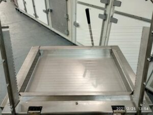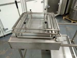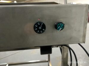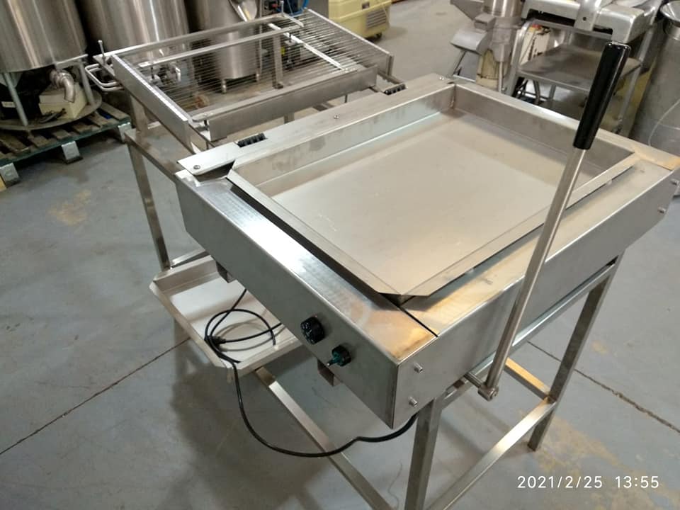 Bañadora-cubridora en acero inoxidable nueva, con 2 cubas para 2 tipos de chocolate. Ideal para bañar bizcochos, magadalenas y hojaldre desde su propia bandeja. Con regulador de temperatura.