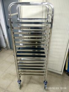 Carro bandejero de acero inoxidable para bandejas de 60×40. 15 estantes con más altura entre baldas (8 cm) ideal para los roscones. Ruedas de nilon, freno y barra de seguridad para impedir el deslizamiento de la bandeja.