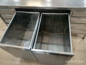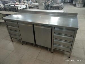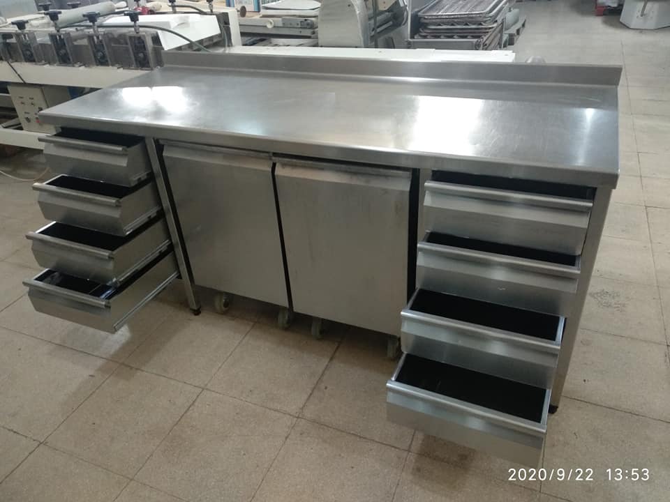 Mesa de acero inoxidable super completa. Con cajoneras en los extremos de 4 cajones cada lado y cajones harineros centrales con ruedas.