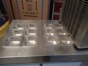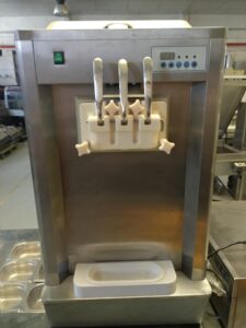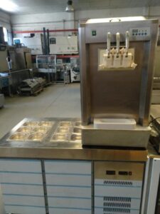 Mesa fría con 2 puertas y cubetas para toppings y máquina de helados soft para 2 sabores que pueden salir de manera independiente o mezclados.